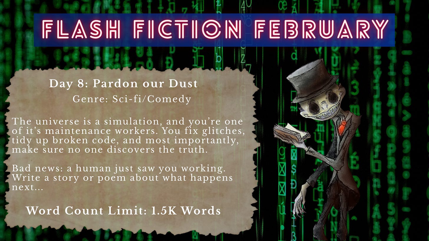 We have arrived at Day 8 of Flash Fiction February. Today’s prompt asked us to step behind the curtain of reality: The universe is a simulation, and you are the maintenance worker fixing a glitch.
